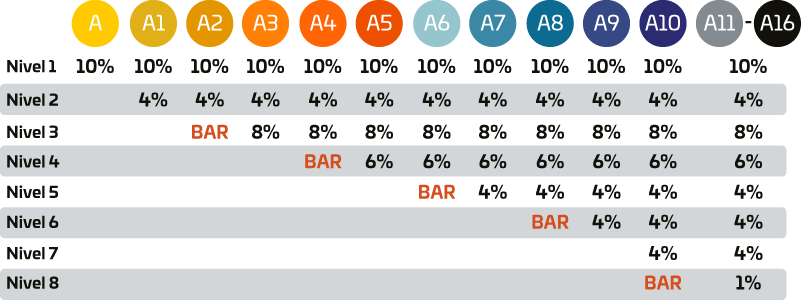 Empieza a ganar participaciones a partir del rango A6 en el 8% del total de las ventas comisionables globales de la empresa.